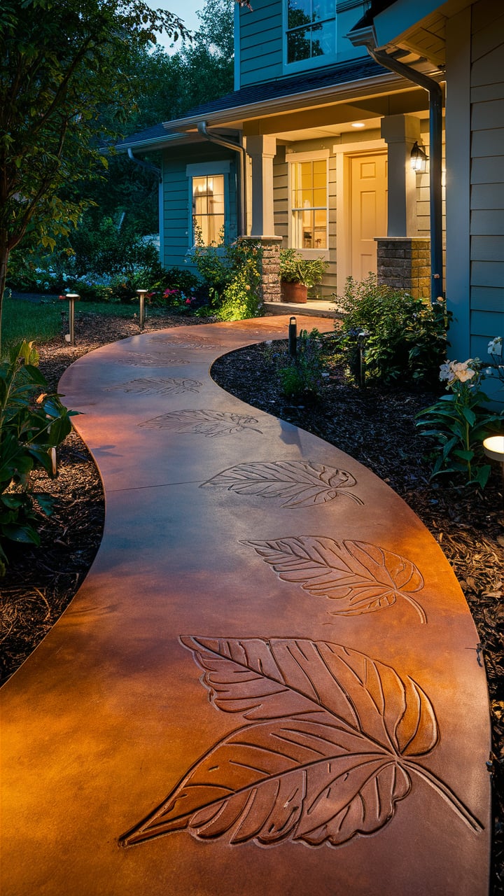Etched concrete walkways feature custom patterns created with acid or sandblasting, allowing you to incorporate leaves, vines, floral motifs, or even abstract artwork directly onto the walkway surface.