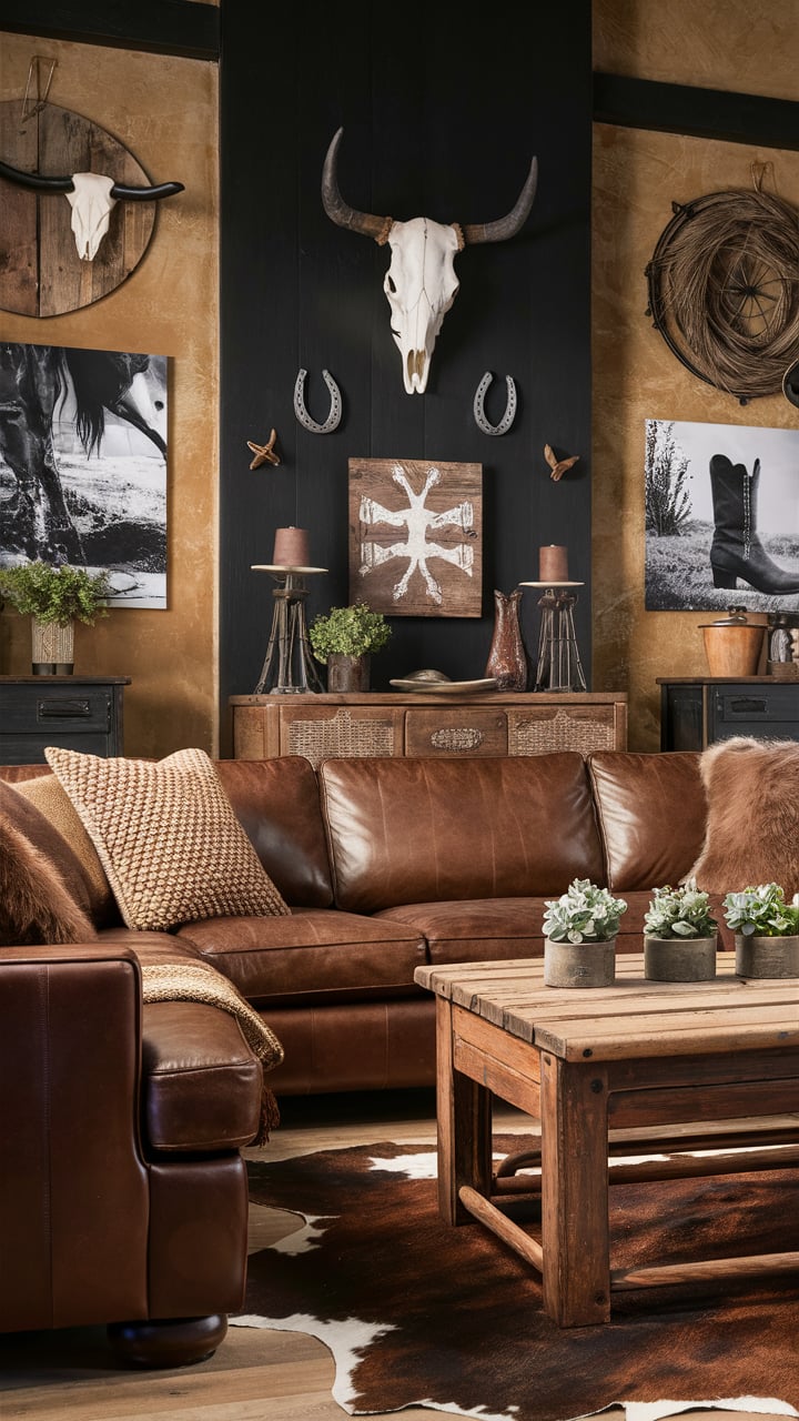 Few things say “cowboy” like a genuine (or faux) cowhide rug. It adds texture, movement, and a direct connection to the Western lifestyle.