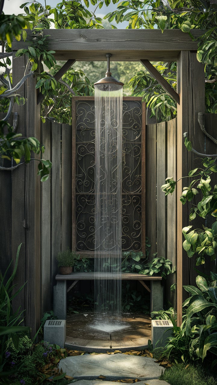 Create a magical outdoor escape by placing your shower beneath a wooden pergola draped in climbing vines like wisteria, grapevine, or honeysuckle. The pergola provides partial shade and structure, while the greenery enhances the rustic, organic vibe.