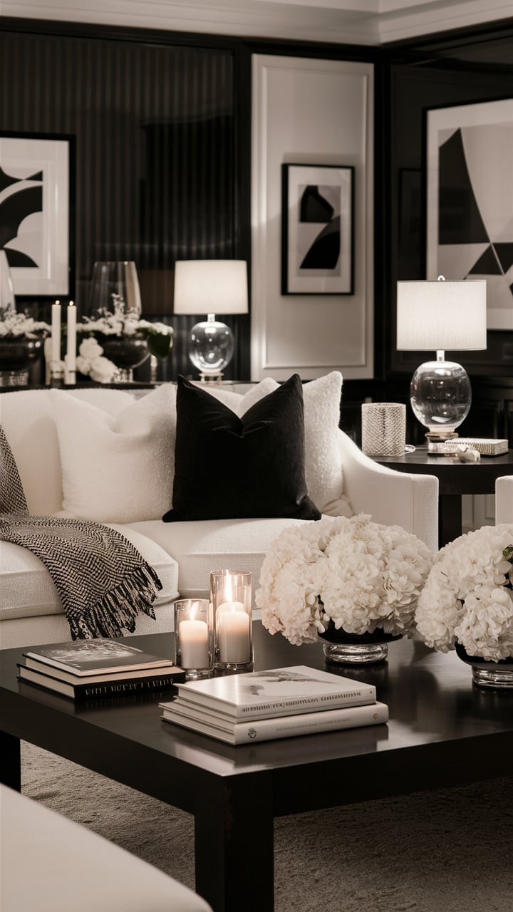 A black-and-white scheme thrives in simplicity. Too many small decor pieces can disturb the clean, elegant look. Opt for fewer, larger statement pieces.