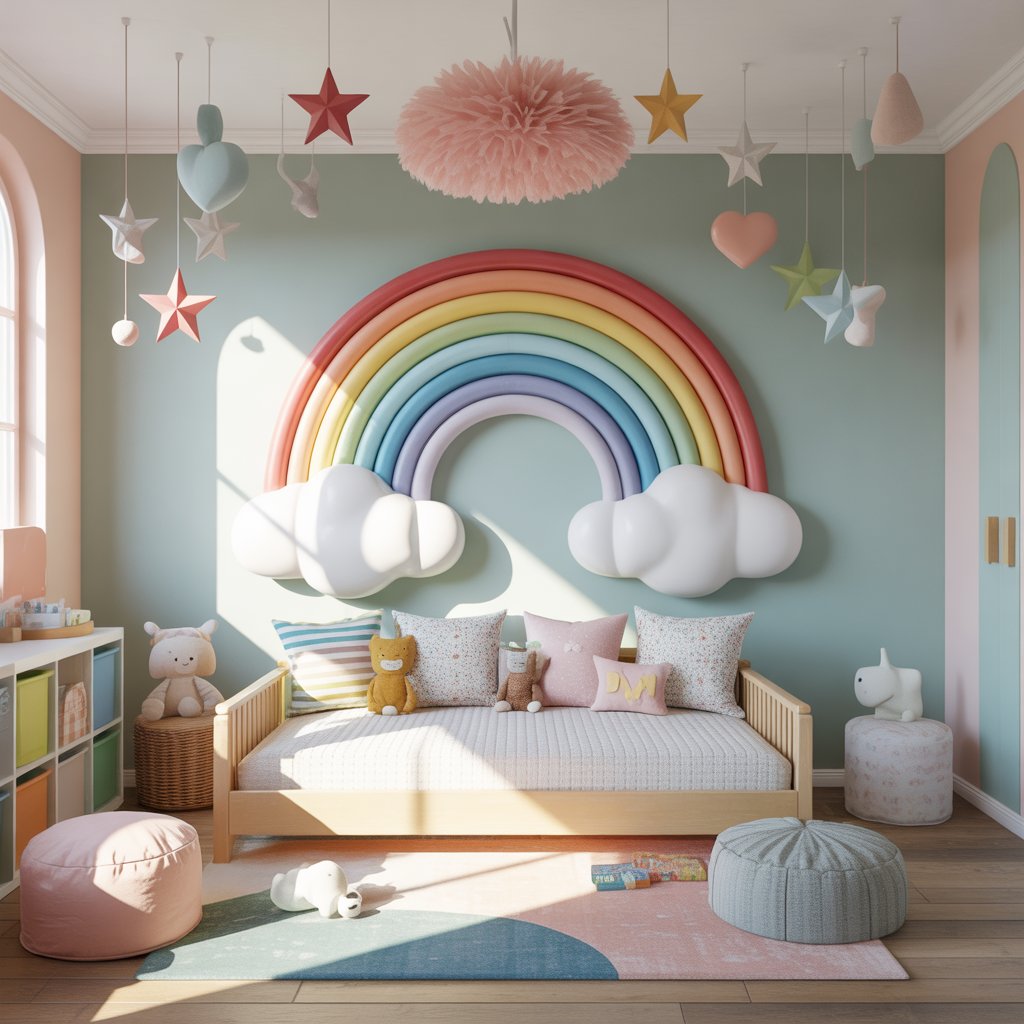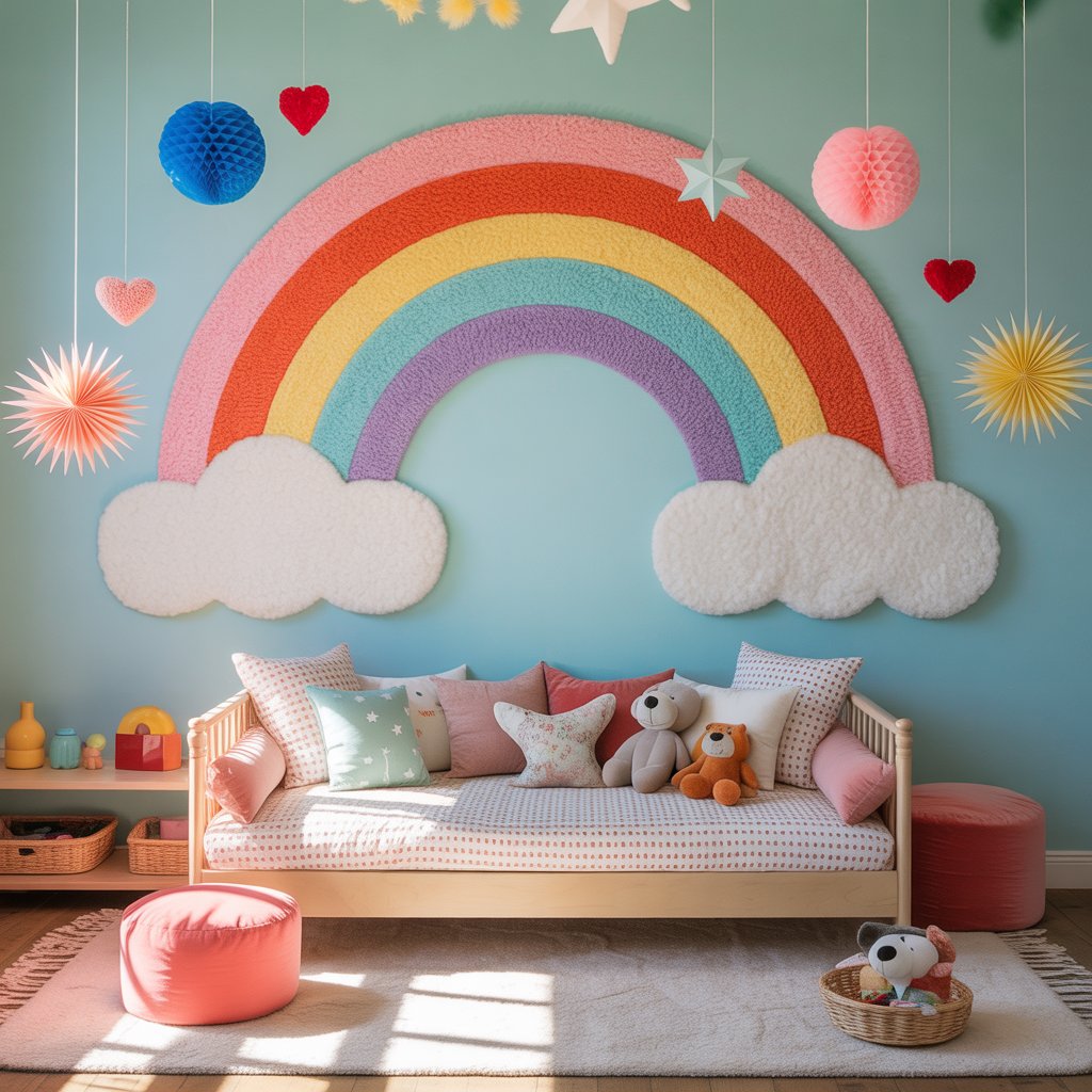 A rainbow wall mural instantly sets the tone for a vibrant, dynamic space. Whether painted by hand, applied as wallpaper, or designed using decals, this feature creates a bold statement wall that becomes the room’s focal point.