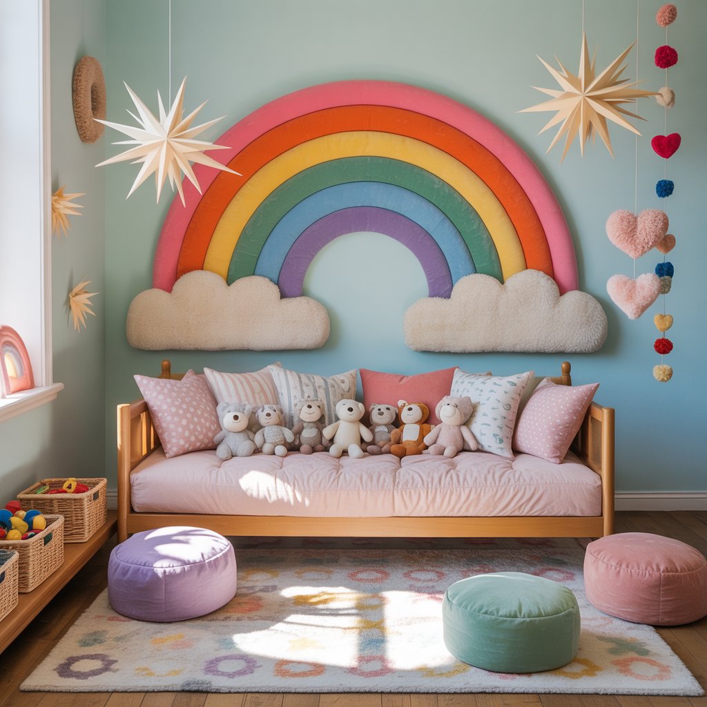 - How to Style: Use a rainbow bean bag, multicolored floor cushions, or a soft rainbow-patterned throw blanket.