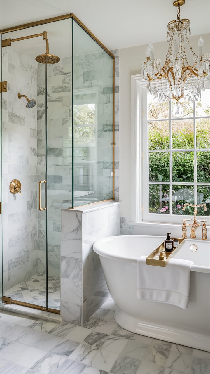Design idea: Add a built-in marble bench with gold-accented edges for extra comfort.