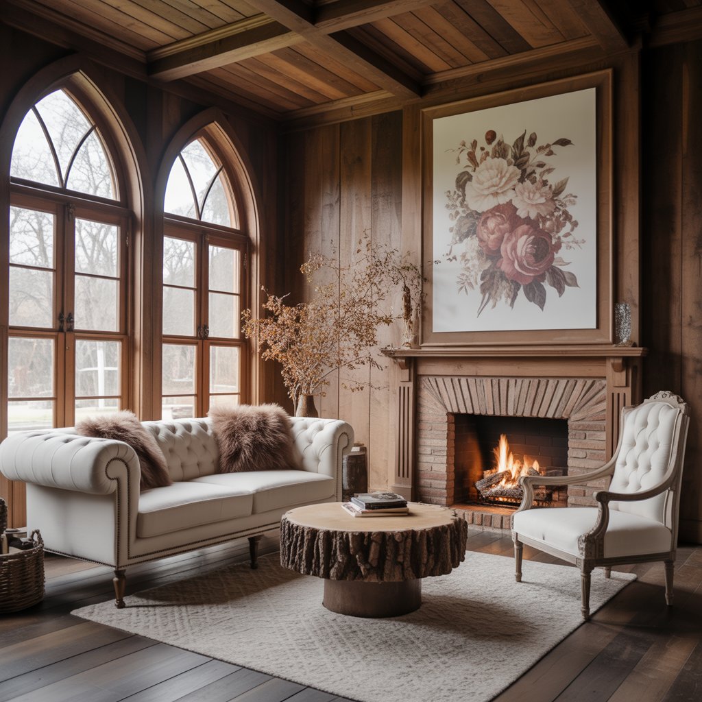 Few elements embody rustic charm as effectively as natural wood beams. With their grain patterns, subtle imperfections, and rich tones, these beams create a warm, grounded atmosphere. Pair them with neutral furniture, linen textures, and warm lighting for a cozy, welcoming living room.