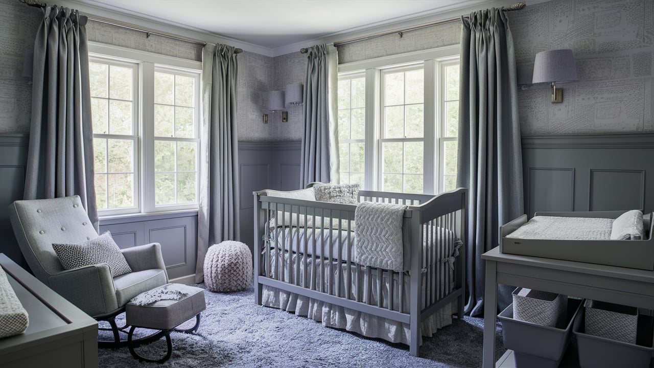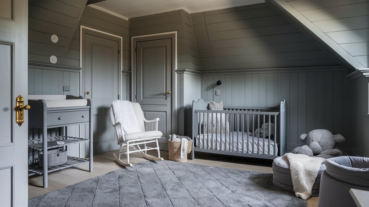 Wainscoting introduces depth and classic charm to any room. Painted in grey, it brings quiet elegance to the nursery while protecting lower walls from scuffs.