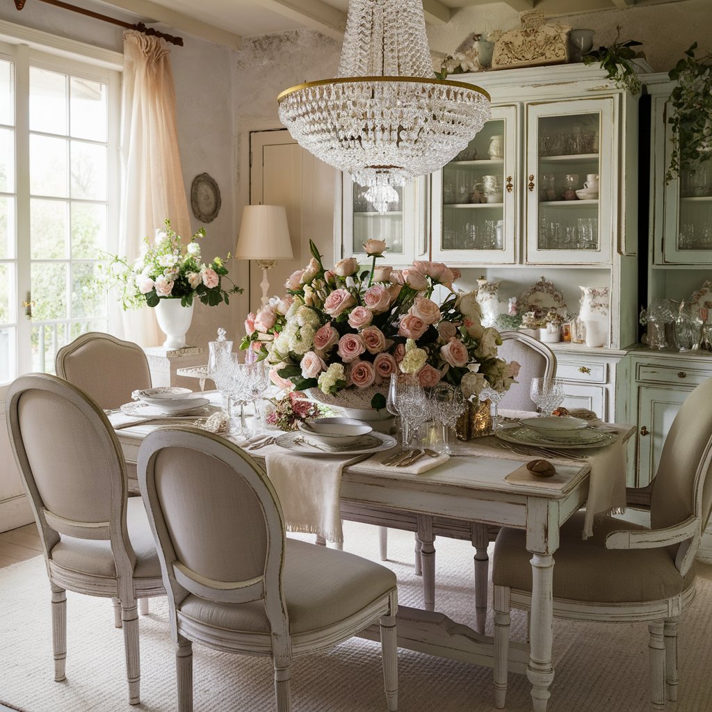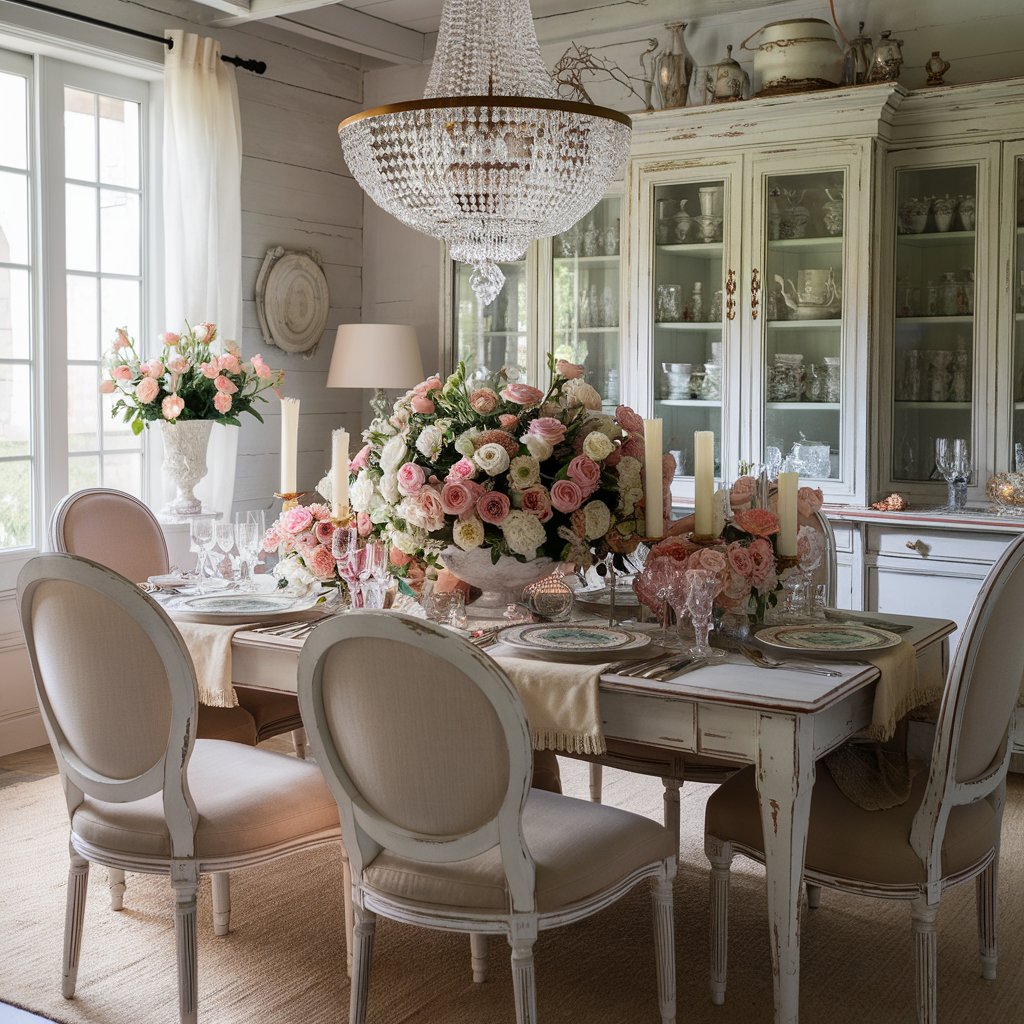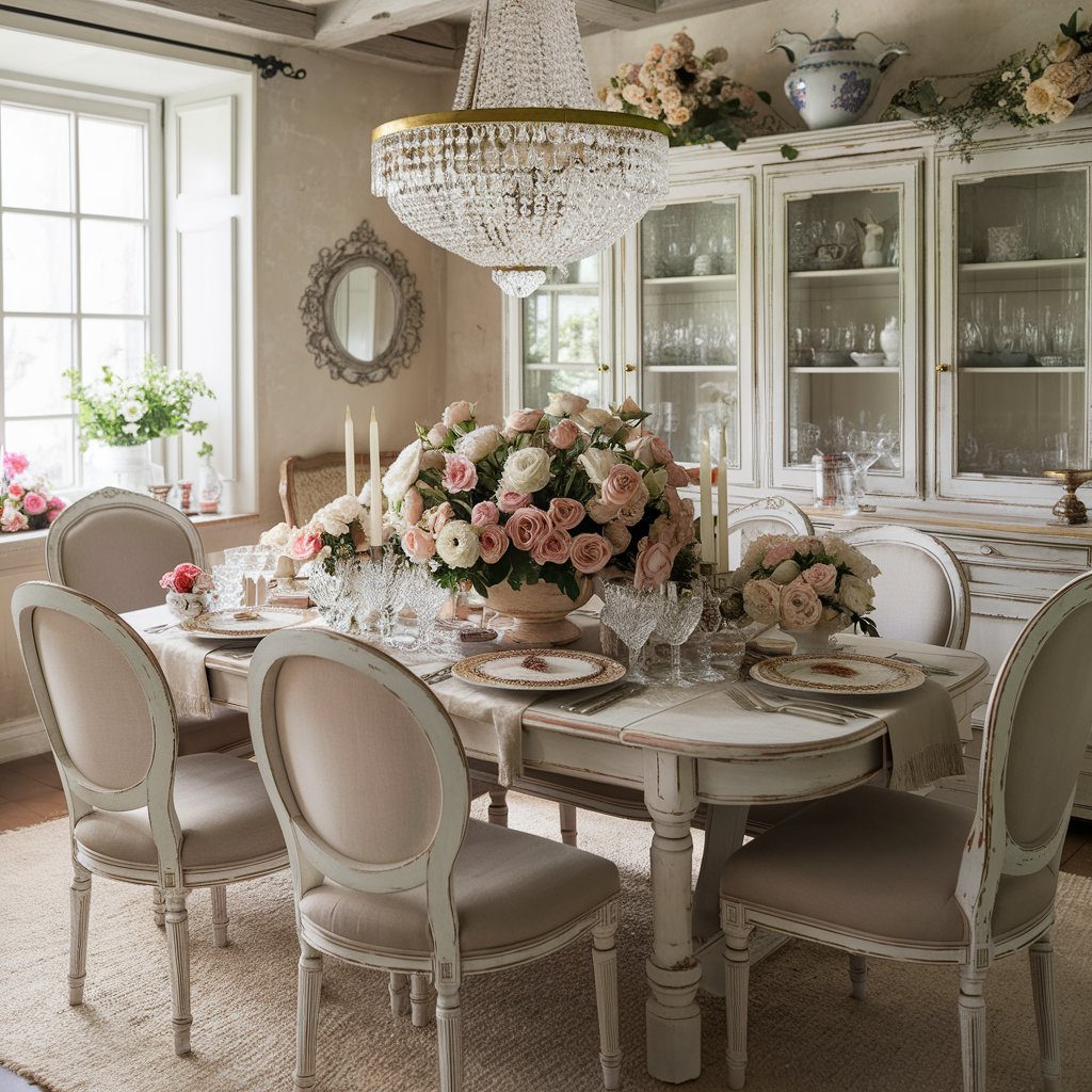 No French country dining room is complete without flowers. Fresh arrangements of roses, lavender, or wildflowers in ceramic pitchers or vintage vases bring life and fragrance into the room. Seasonal blooms ensure the space always feels fresh and connected to nature.